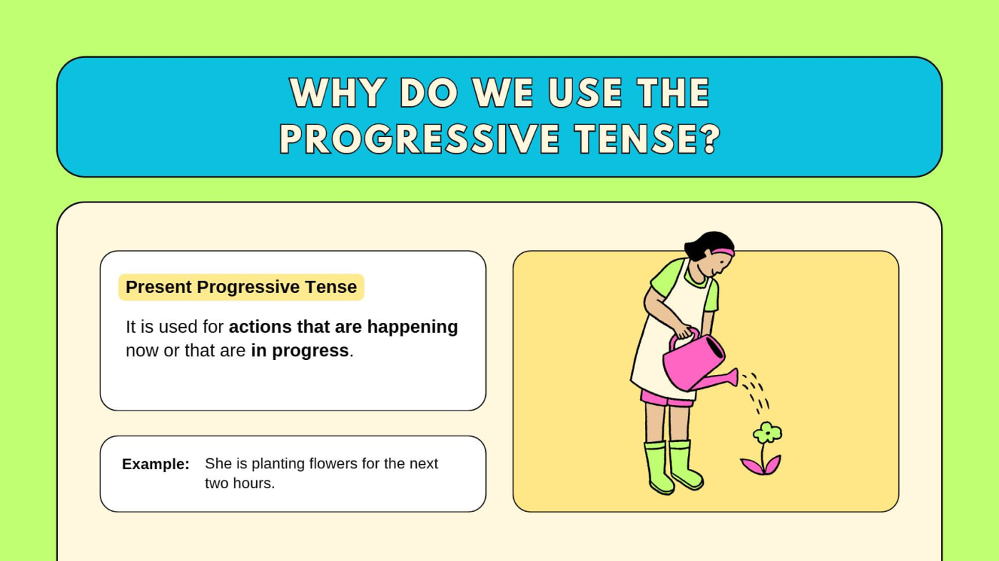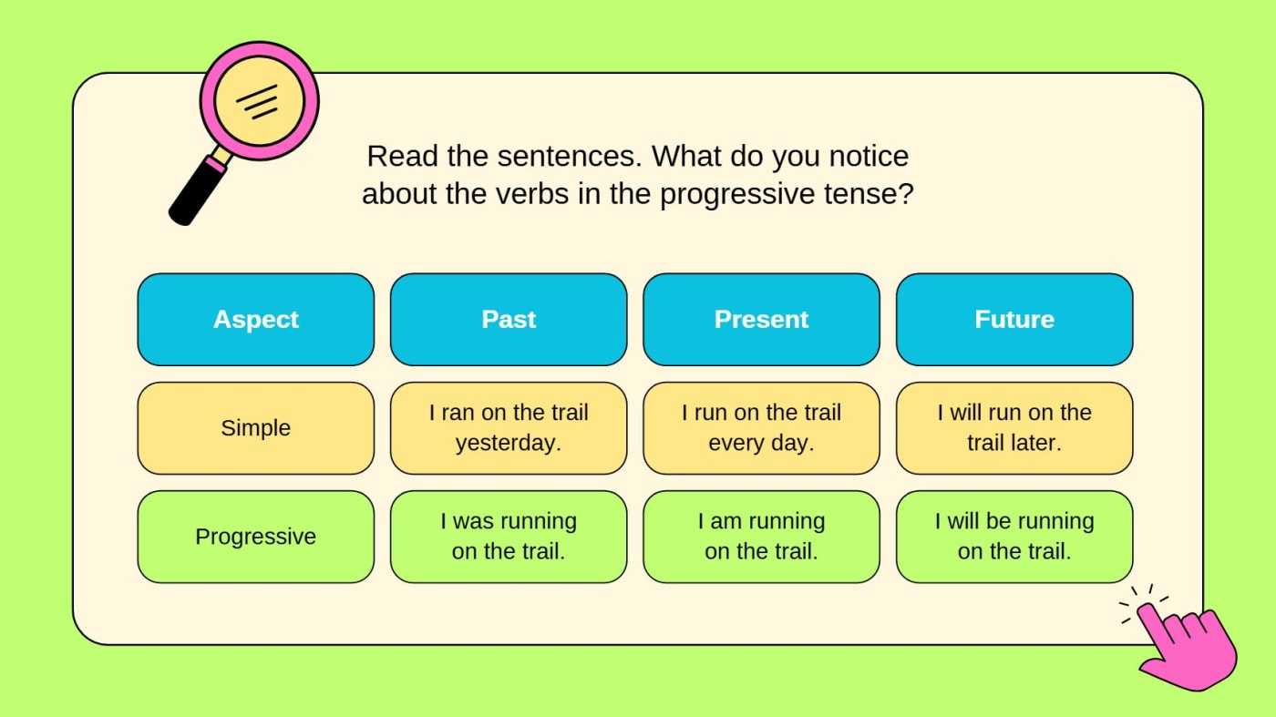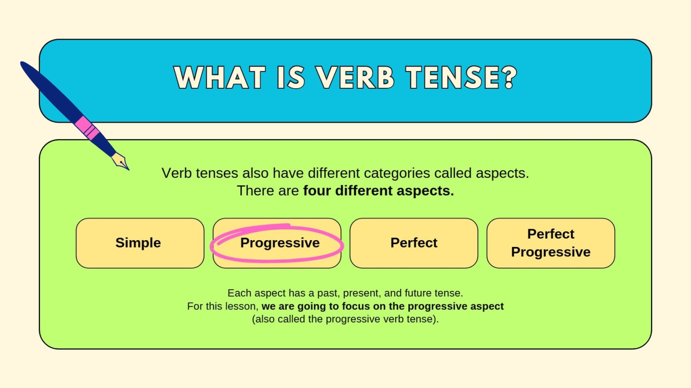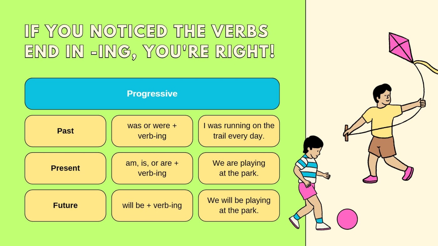 Learn the progressive verb tense (continuous tense) with clear examples of past, present, and future forms. Understand how verbs ending in -ing describe ongoing actions.