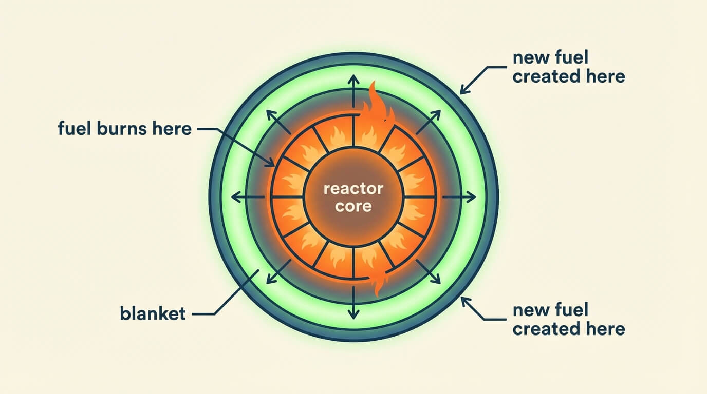 Blanket (surrounding layer): Contains Uranium-238 → Absorbs fast neutrons → Becomes Plutonium-239 (new fuel)