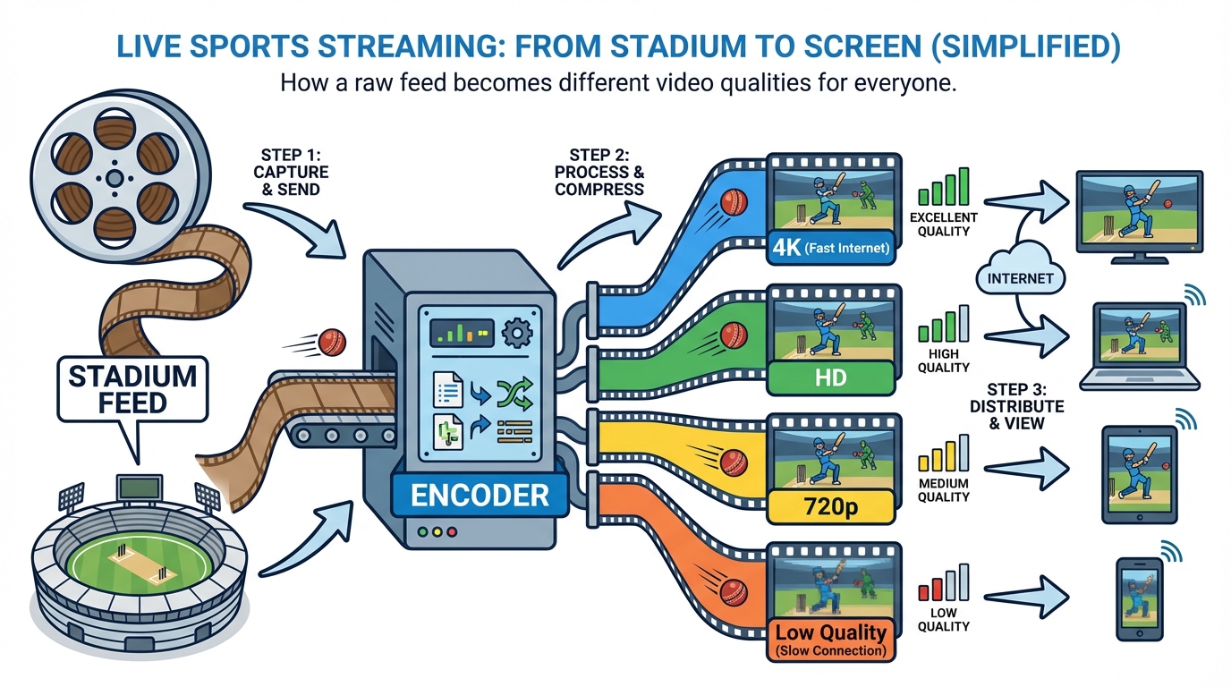 The raw video from the stadium is massive – like trying to send a 4K movie file every second. So engineers quickly "encode" it. This means they compress and create several versions at once: super sharp 4K or HD for fast internet, medium quality for normal 4G, and low quality (like 480p) for slow connections. It's all happening in powerful servers near the stadium or in big data centers.