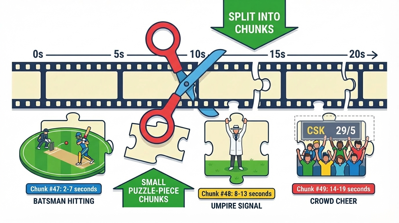You can't send the entire 3-hour match in one go – that would take forever and crash everything. Instead, the encoded video is split into super-small chunks, usually 2 to 10 seconds each. Each chunk is a tiny self-contained piece of the match: "Chunk 1: Kohli faces the ball", "Chunk 2: The boundary is hit", and so on. These chunks are numbered and ready to ship instantly.