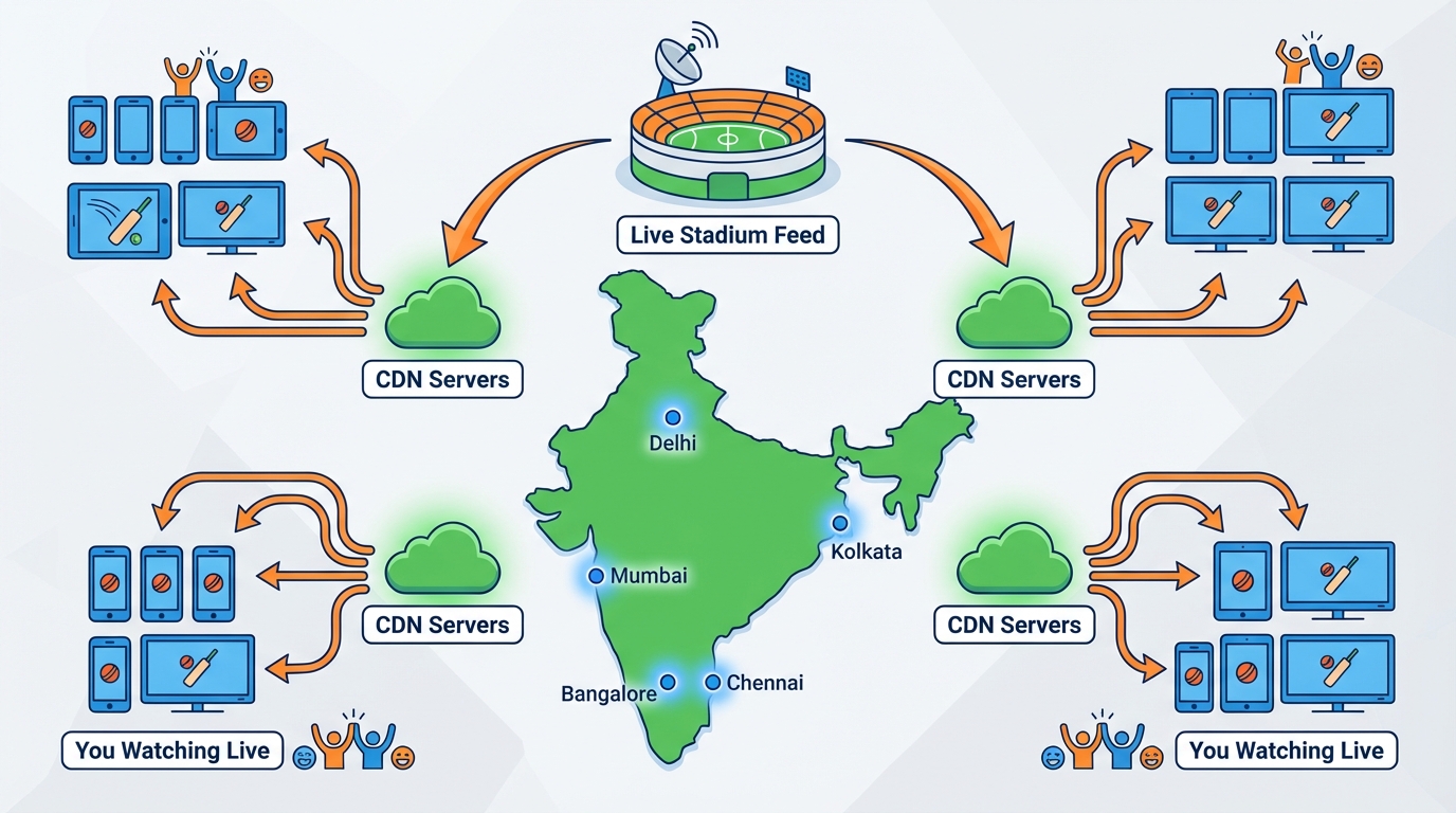 Real-life example: In the 2025 playoffs, when JioHotstar streamed for free to record-breaking crowds, the CDN handled the load so well that even people in remote Rajasthan didn't face lag. Without it, everyone would be stuck buffering like old YouTube videos.