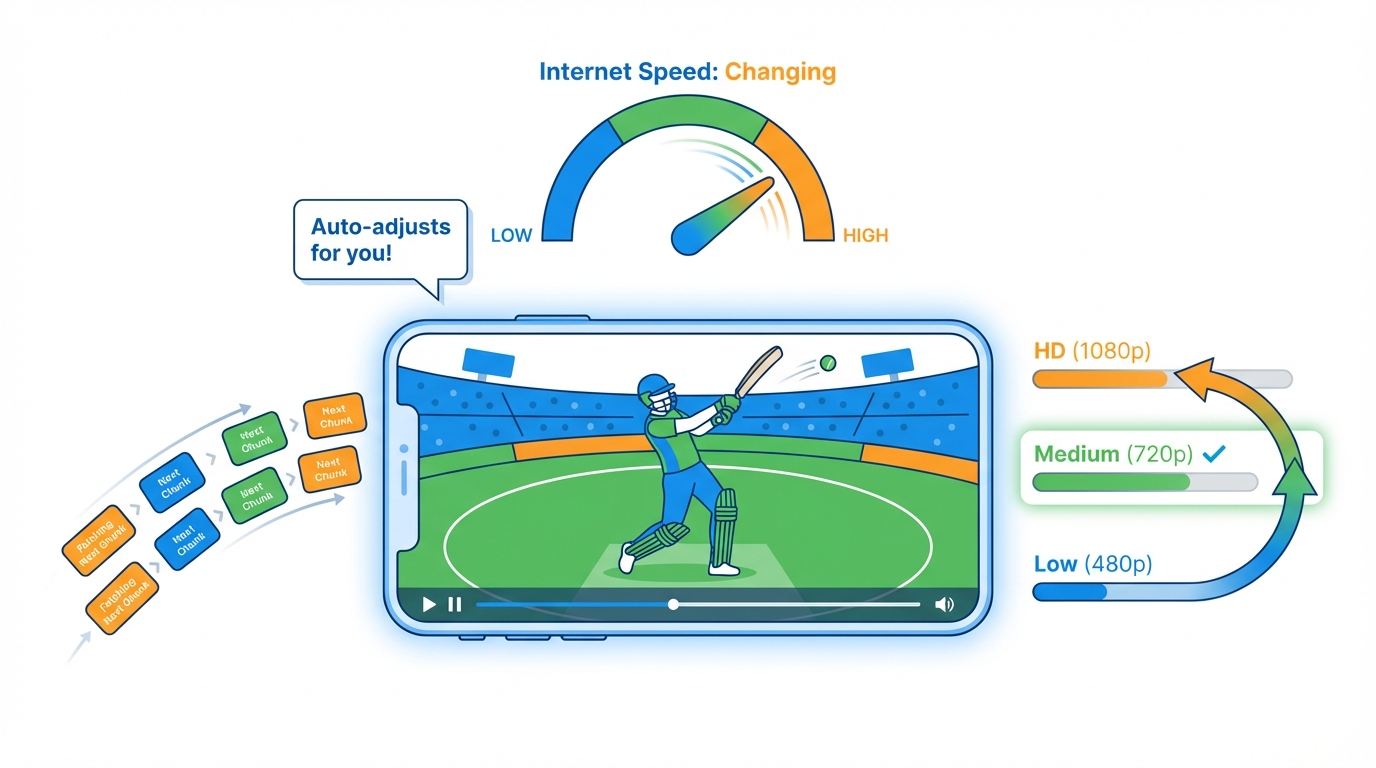 Real-life example: Last IPL, I was watching on a train from Delhi to Agra. Network dipped in tunnels – the player dropped to lower quality for 20 seconds, then jumped back to full HD when signal returned. I didn't miss a single moment of the chase. My roommate on the same train with older app kept buffering – the difference was huge!