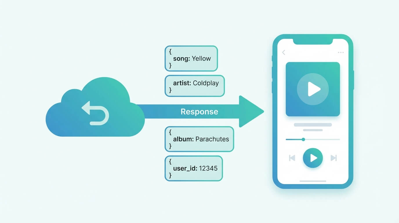 Your Spotify app receives this data and displays it beautifully on your screen. You see album covers, play buttons, and lyrics—all because the API delivered the raw data your app needed.